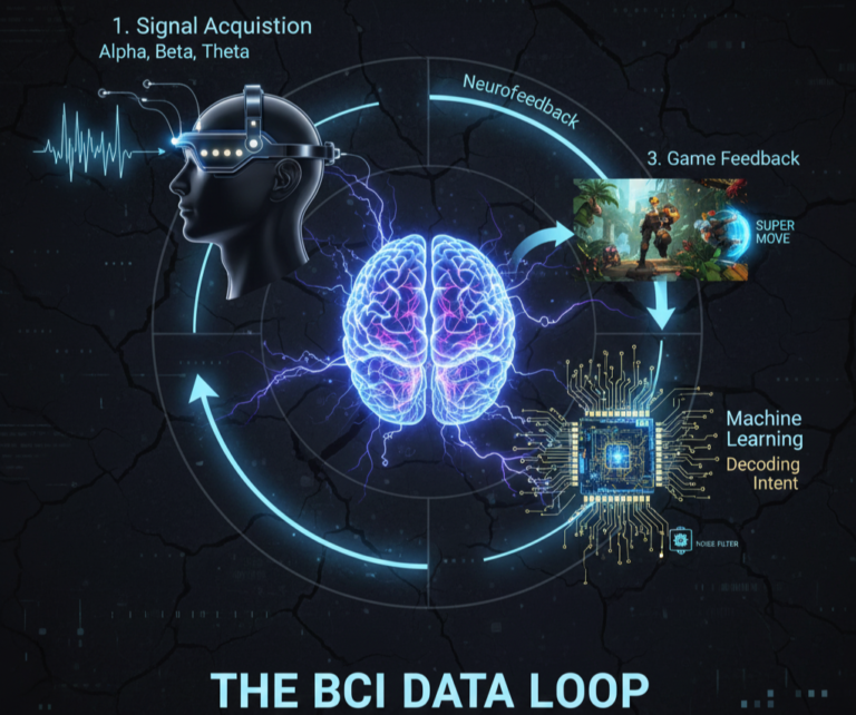 The core of neurogaming is the Brain-Computer Interface (BCI). Think of a BCI as a “universal translator” that turns your biological thoughts into digital code. These systems use EEG sensors (like those from Emotiv or NeuroSky) to listen to the “electrical chatter” of your brain.